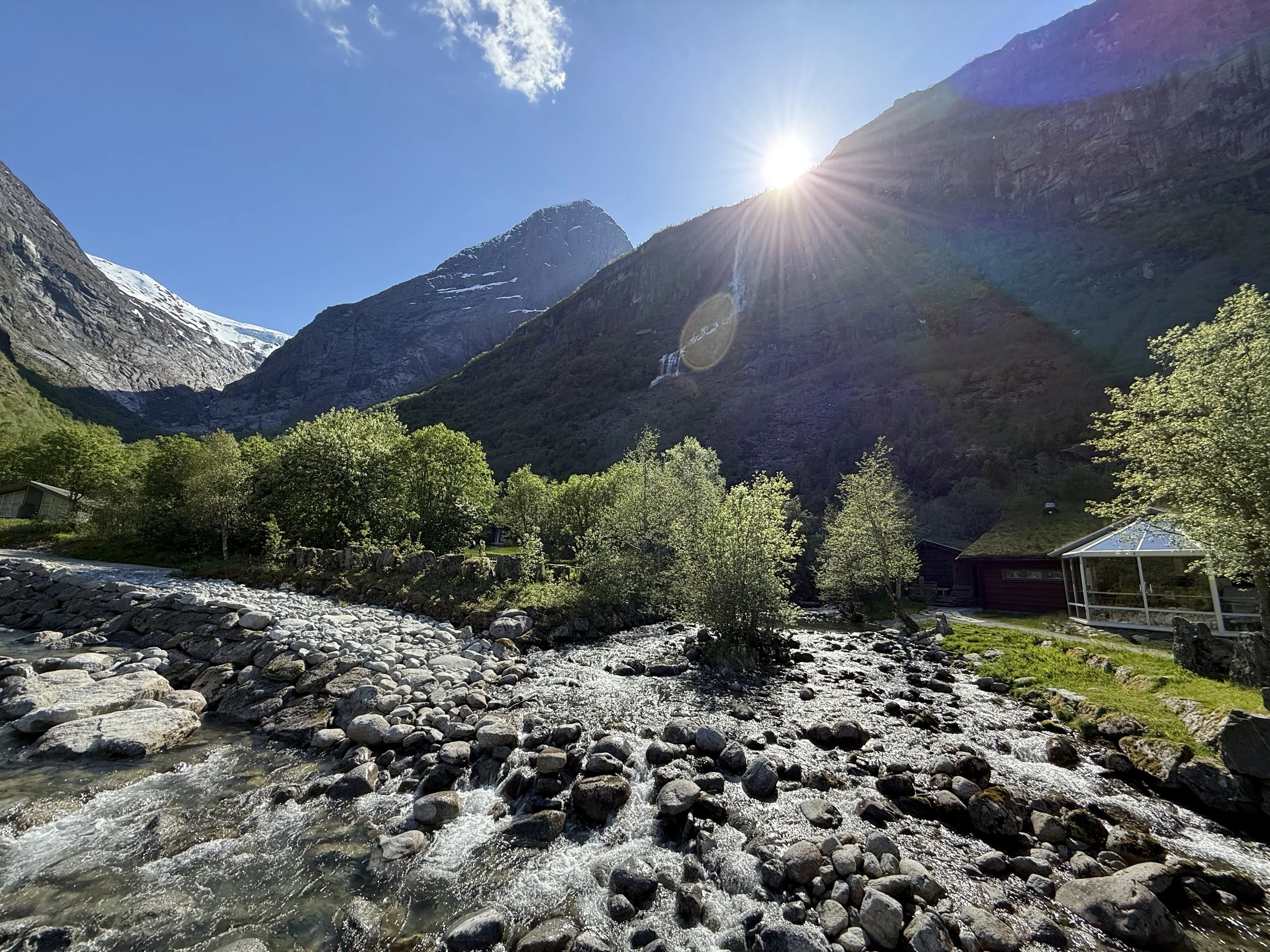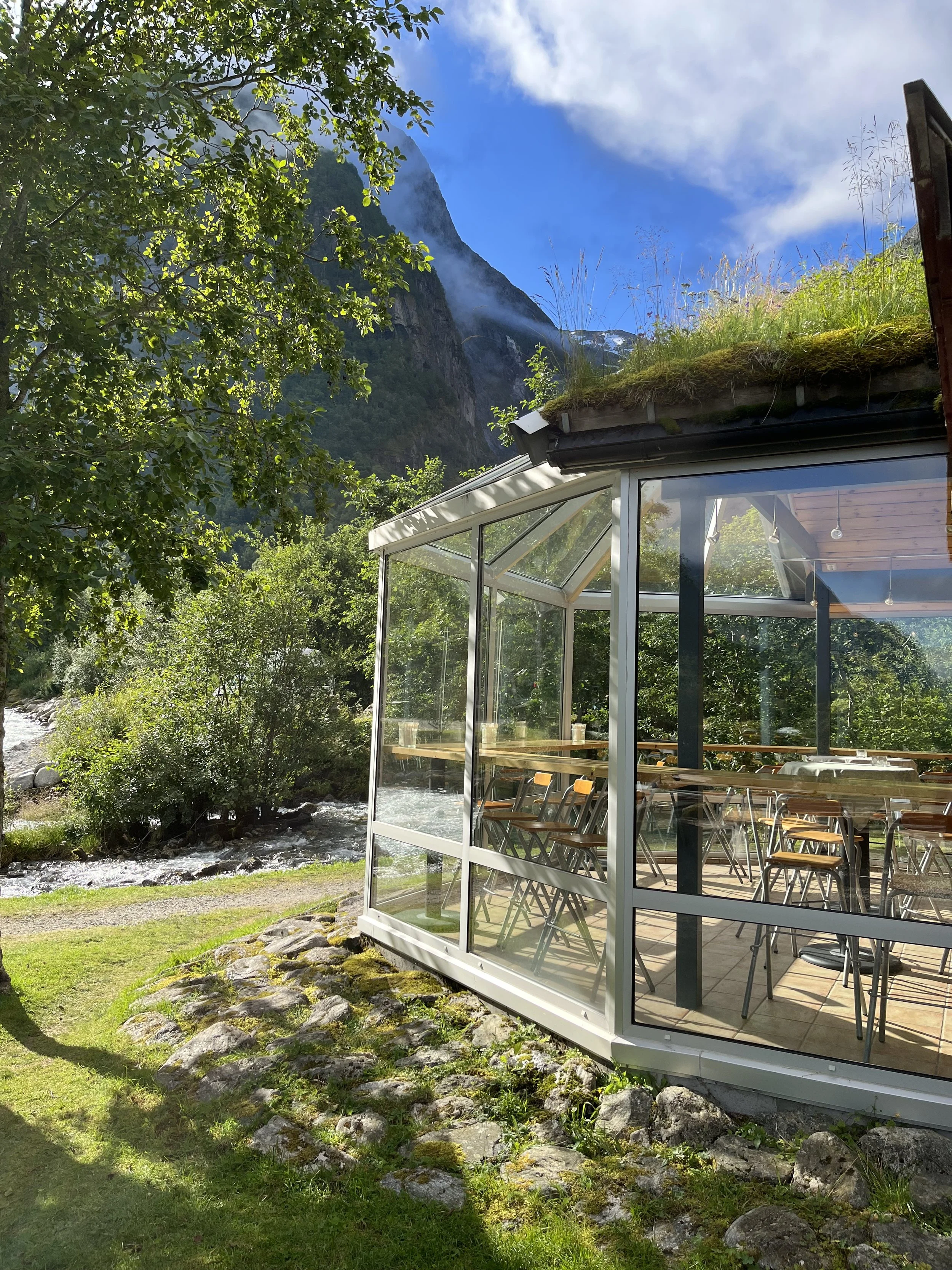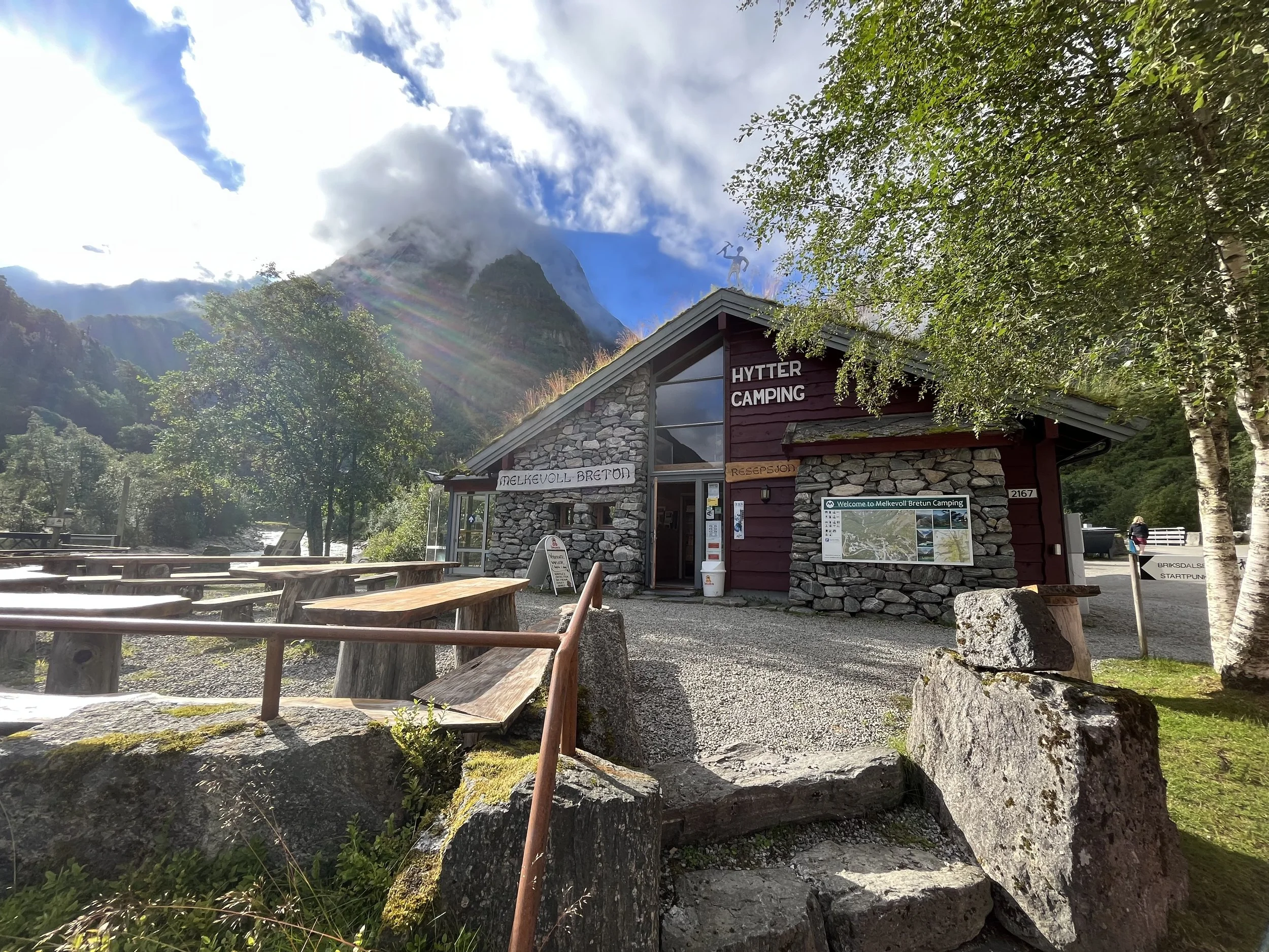 During the daytime the area the area on the other side of the river is dayparking area for guests go for trips to Briksdal glacier, Mt. Kattanakken or Oldeskaret. Our daytime visitors enjoy the café and walks in the inforama path.
