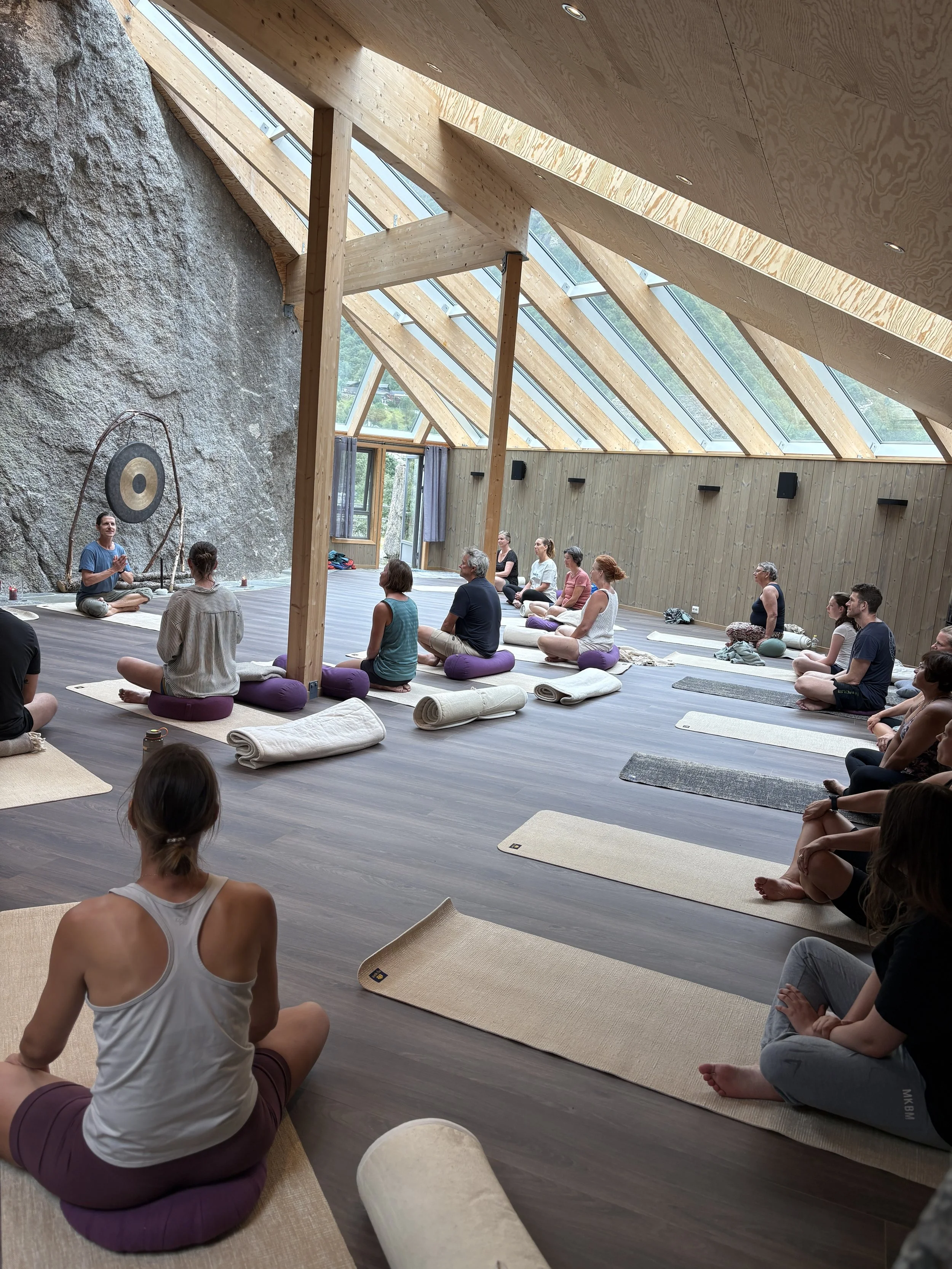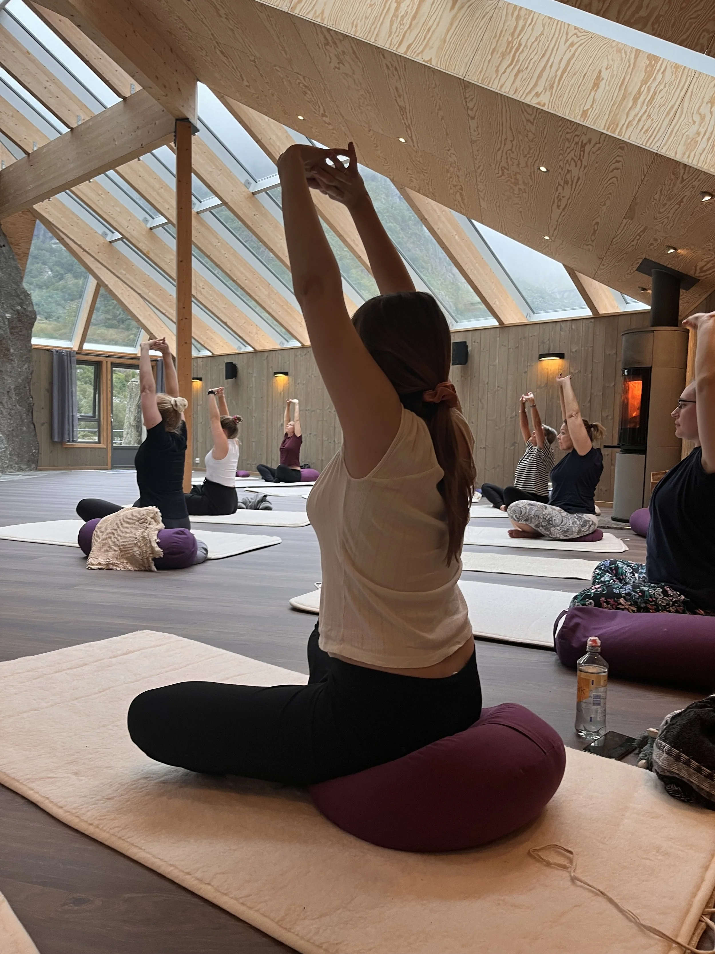 Every week in June, July and August we have yoga classes in the Blue Mountain Hall. This is a special nature room, with views to the nature around us.